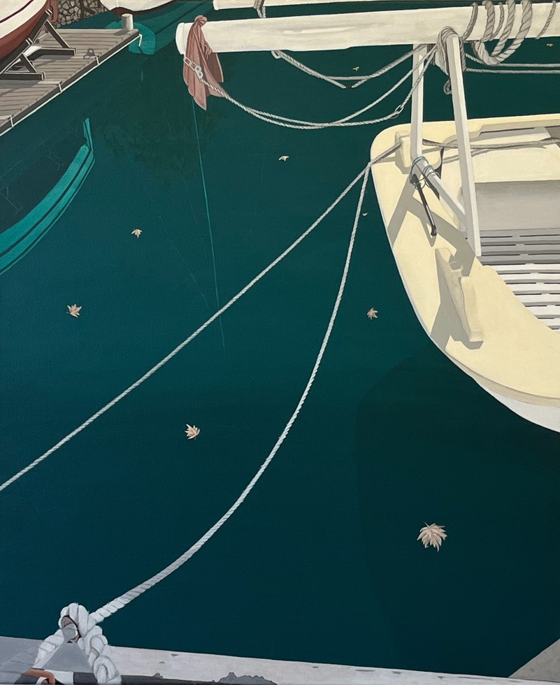 “Meeting Maurits in Constitution Dock” is a playful reference to M C Eschers “Three Worlds’ that came to mind as the artist explored stillness and surface qualities in that iconic location in Hobart, Tasmania. It is a 63cm x 53cm synthetic polymer work on canvas.